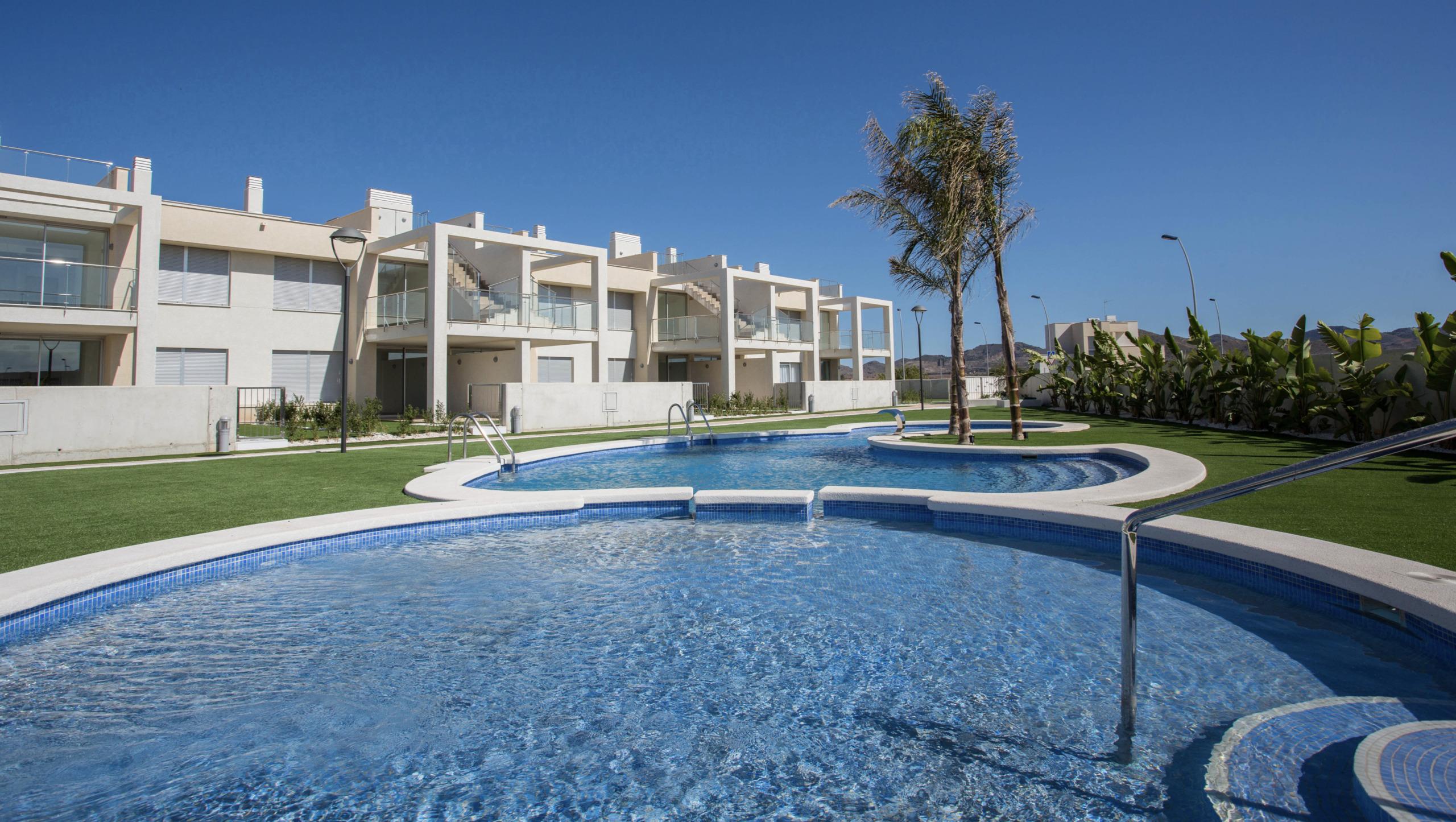 Privé-complex van geschakelde woningen met twee of drie slaapkamers, twee badkamers en gemeenschappelijk zwembad in Pilar de la Horadada. [...]